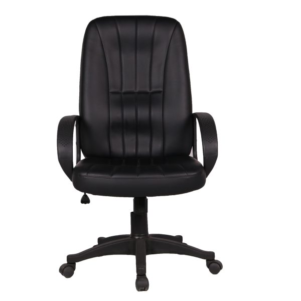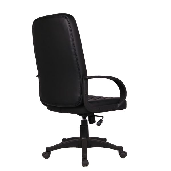 Brazo de polipropileno fijo, respaldo y asiento tapizados en tacto-piel, acojinado con hule espuma de 24kg/m3 base de nylon de 24″. Mecanismo: palanca para ajustar altura y bloqueo de reclinamiento, perilla para ajustar la tensión del reclinamiento. Color negro