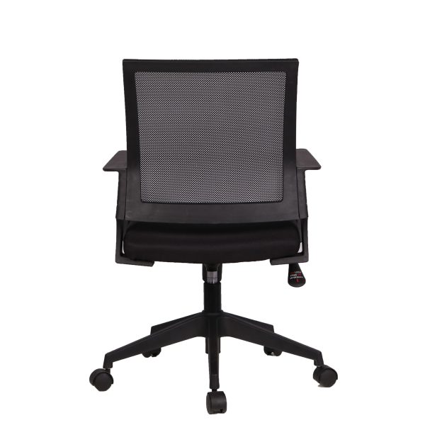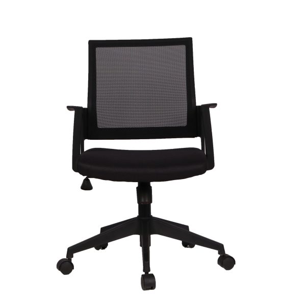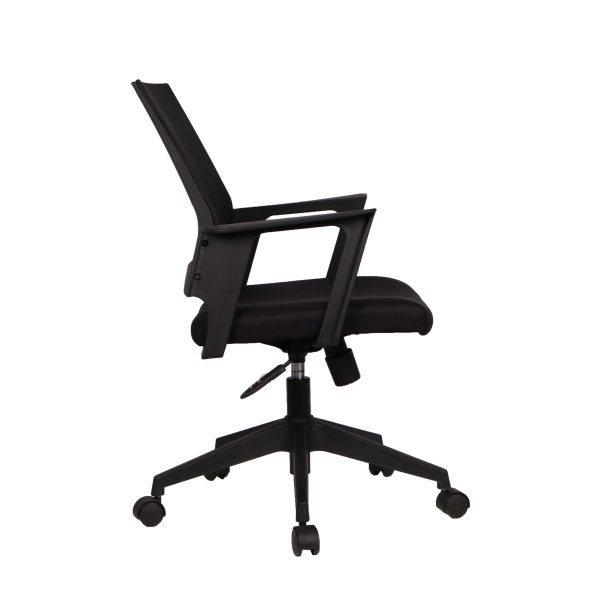 Brazo de polipropileno fijo color negro, asiento grande acojinado con hule espuma de 24kg/m3, base spider nylon de color negro de 25″. Mecanismo: palanca para ajustar altura y bloqueo de reclinamiento , perilla para ajustar la tensión del reclinamiento. Respaldo en mesh asiento tapizado en tela. Color:Negro